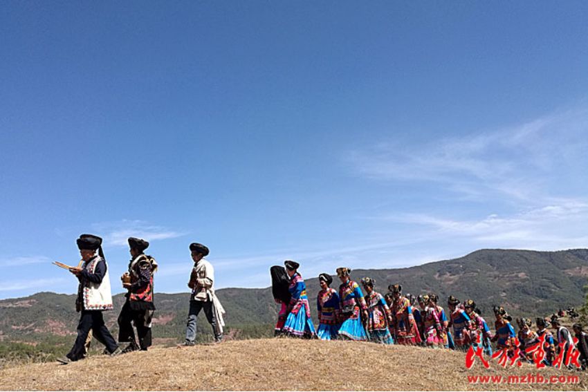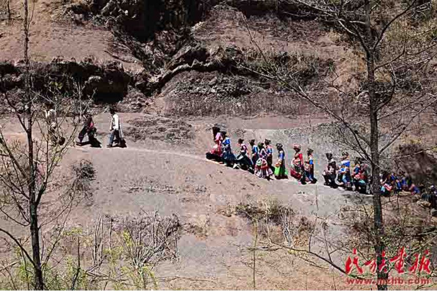 送親的隊伍走在崎嶇的山路上