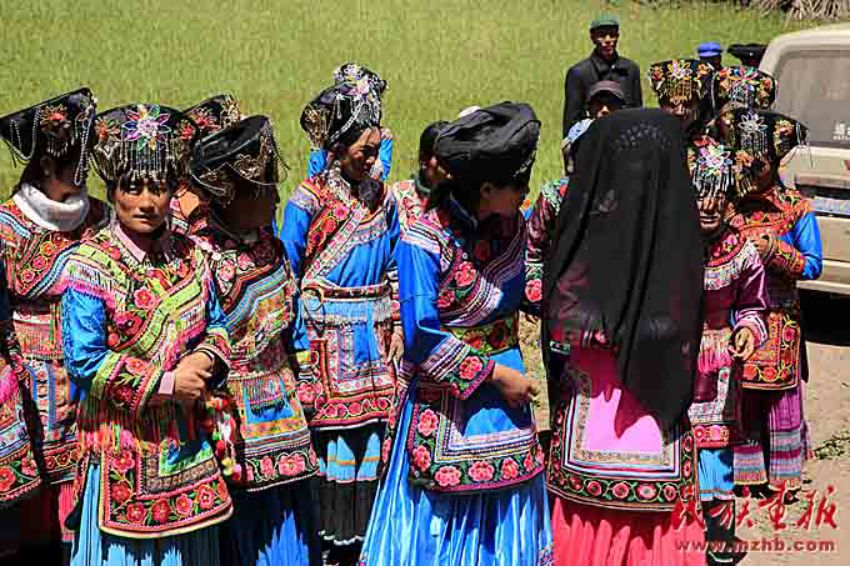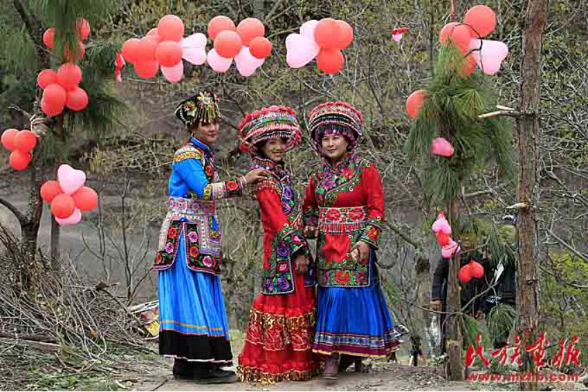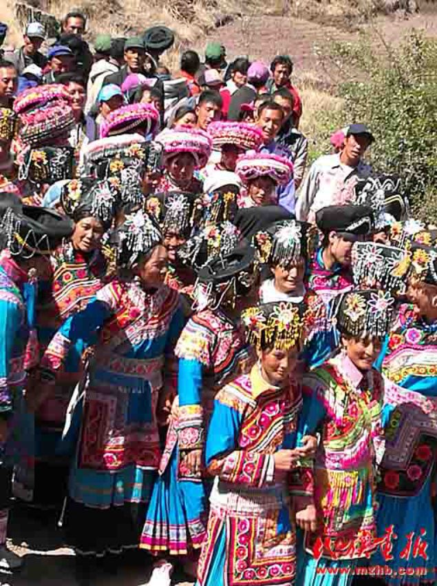 娶親要請客,當?shù)乩圩逭埧椭恍杩陬^傳話,凡是知道的親戚朋友都會來參加。娶親隊伍主次兩位主婚人,伴郎伴娘各一人,背新娘和嫁妝的二人,接親的四至六人,其中有一至兩個歌手,一行十二人組成。帶著早已為新娘準備好的花短衣、長裙、銀手飾、圍腰鏈、銀泡、銀項等飾物興高采烈地從新郎家出發(fā)。