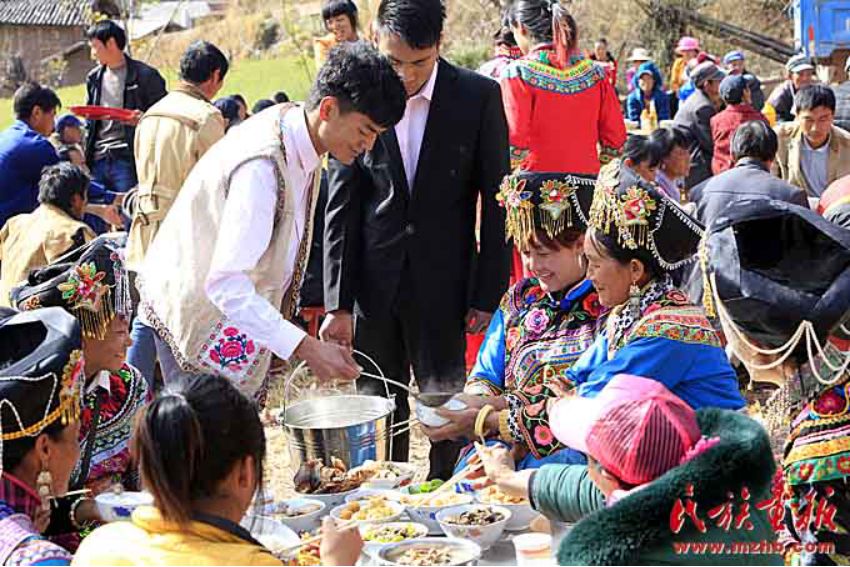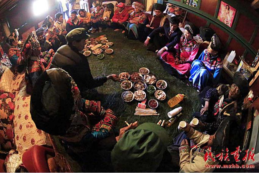 穿長衫,戴著包頭的新郎,把新娘接入正堂屋,將送親的人群迎進臨時搭建的青棚屋休息。青棚,是傈僳族人辦婚事時砍來毛櫟樹、香樹枝等臨時搭起的棚子。既清新又涼爽舒適??梢杂脕斫哟e客,也可以作為跳舞、唱曲子的活動場所。晚餐就在青棚里進行,宴席一般不用桌子,酒菜擺在青棚下面鋪好青松毛的地上,客人八個一圈,席地坐在青松毛上,圍著喜筵,既歡樂又開心的喝著美酒、品嘗佳肴。晚飯菜肴十分豐盛,足見主人家的好客和廚師的高超手藝。菜出雙不出單,菜的顏色出紅不出白。一切都象征著成雙成對,吉祥如意。