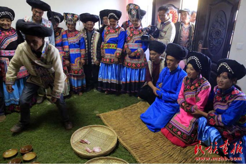一番熱鬧之后,大家坐定,主婚人向女方父母過彩禮,這時,伴娘為新娘子換上新衣服。女方家早已為接親人準備好豐富的宴席,盡興喝酒,盡情用膳,其樂融融。飯后,男女雙方圍成圓圈邊舞邊歌,歌詞大多是女方對男方提出的一些難題,而有備而來的娶親隊伍中的歌手,往往對答如流,直到娶親人取得勝利,才準接走新娘。臨走時,娶親隊伍一行人要在女方家打跳三轉(zhuǎn),再到外場子里跳舞,以示新娘對娘家依依不舍之情。一切準備就緒,娶親人、送親人和新娘就一同朝男方家進發(fā)。