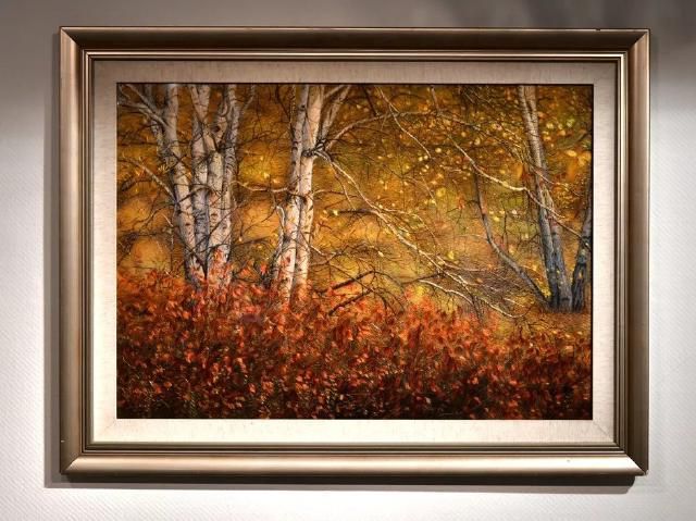 本作品表現(xiàn)的是深秋時節(jié)森林金黃,白樺樹落葉點(diǎn)點(diǎn)、露出白色枝干的景象。整體繡面用色豐富多彩,炫而不俗;針法靈活多變,層次鮮明,仿佛置身其間,給人以美的享受。