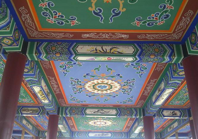 彩畫著色是一項關(guān)鍵的工序,不能有半點差錯。工匠們?yōu)椴煌伾O(shè)定了代號,一米色、二淡青、三香色、四硝紅、五粉紫、六洋綠、七佛青、八石黃、九紫色、十黑煙、十一紅等。將代號直接寫在地仗上,然后根據(jù)色號將各種色料對號入座,涂刷著色一、二遍,待干后再刷一遍光油罩光,以起保護作用。彩畫所用色料一般均為各色成品油漆。