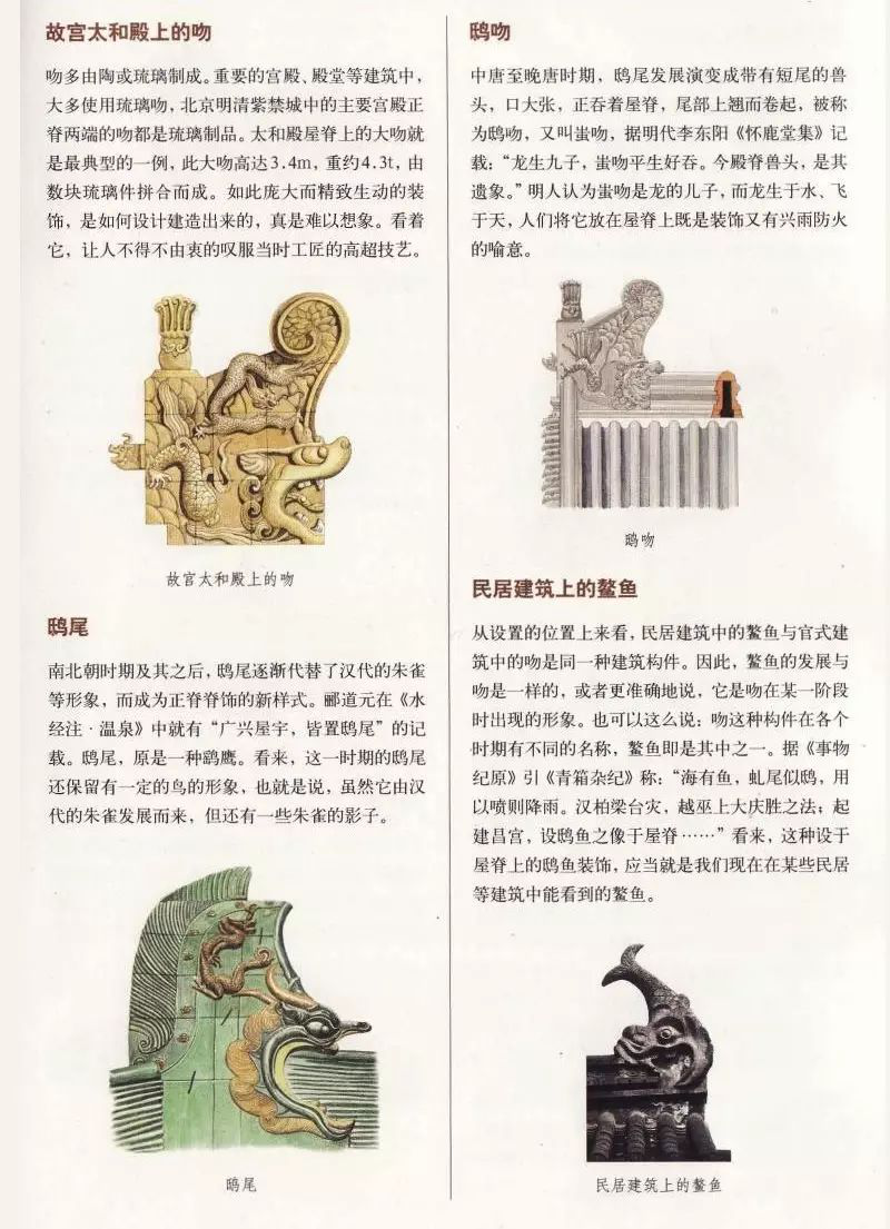 4. 正脊裝飾:在我國(guó)古代的很多建筑中,特別是一些等級(jí)較高的建筑中,其屋頂正脊上往往設(shè)有各色裝飾。除了常見(jiàn)的正脊兩端的吻合正脊中心的寶頂外,在正脊的前后兩個(gè)立面上,還會(huì)雕飾或塑有花、草或龍等。
