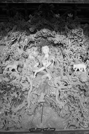 摩尼殿內(nèi)槽北壁是一座泥塑五彩懸山,上有塑像數(shù)十尊,正中為五彩觀音菩薩像,俗稱“倒坐觀音”。倒坐是指觀音菩薩不坐在大殿的正中央,而在后壁倒坐。觀音像衣袂飄飄、彩妝絢麗,面容秀麗恬靜,是古代彩塑中不可多得的藝術(shù)珍品。整個大殿的平面呈十字形,有16個凸轉(zhuǎn)角和8個凹轉(zhuǎn)角,形制特別。梁思成曾贊譽(yù):“這種的布局,我們平時除去北平故宮紫禁城角樓外,只有在宋畫里見過,那種畫意的瀟灑,古今的莊嚴(yán),的確令人起一種不可言喻的感覺?!?/p>