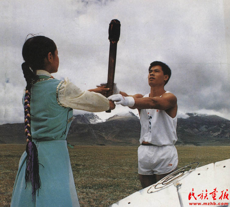 1990年,象征著亞洲30億人民“團(tuán)結(jié)、友誼、進(jìn)步”的第十一屆亞洲運動會在中華人民共和國首都北京隆重開幕。8月7日,在西藏的念青唐古拉峰下,藏族少女達(dá)娃央宗點燃火把,傳遞給前世界冠軍、“體操王子”李寧(壯族),李寧接過圣火,點燃了火種盒內(nèi)的火種《民族畫報》1990年第11期