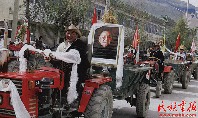 2004年8月21日,西藏山南地區(qū)乃東縣的農(nóng)牧民高懸鄧小平畫像,開著拖拉機(jī)在山南街頭巡游,表達(dá)對改革開放總設(shè)計師鄧小平同志的深切緬懷。改革開放后,西藏自治區(qū)農(nóng)牧民的年人均收入已從改革開放初期的幾百元上升至2004年的2000元左右,西藏城鎮(zhèn)居民年收入則超過7000元,位居西部前列?!睹褡瀹媹蟆?008年第12期