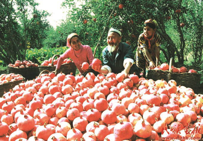 興邊富民行動是1999年中央民族工作會議部署的一項重要的邊境建設(shè)工程,旨在“富民、興邊、強(qiáng)國、睦鄰”。興邊富民行動為新疆的發(fā)展帶來了實惠,2006年,看著豐收的石榴,維吾爾族農(nóng)民樂開了花?!睹褡瀹媹蟆?007年7期