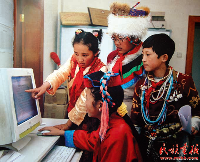 曾幾何時,電腦、網(wǎng)絡(luò)等現(xiàn)代化的交流手段離邊疆少數(shù)民族地區(qū)那么遙遠(yuǎn),隨著經(jīng)濟(jì)發(fā)展、國民消費水平的提高,一些高科技、現(xiàn)代化的事物在普通群眾中輕而易舉地普及了。圖為2007年,西藏門巴族、珞巴族的兒童在學(xué)電腦。(中國民族圖片庫資料)