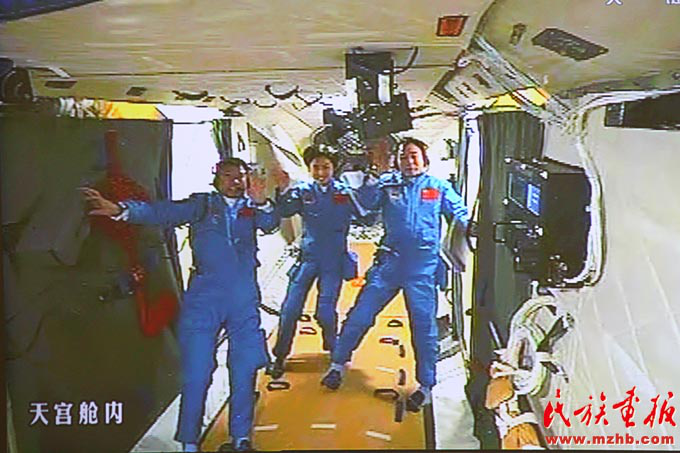 2012年6月18日,神舟九號飛船與天宮一號完成自動交會對接,兩飛行器形成穩(wěn)定運行的組合體后,三位航天員先后進(jìn)入天宮一號目標(biāo)飛行器,這實現(xiàn)了中國載人航天歷史上首次對一個在軌運行的航天器的拜訪和駐留。圖為在北京航天飛控中心大屏幕拍攝到的航天員景海鵬、劉旺、劉洋在天宮一號實驗艙內(nèi)的畫面?!睹褡瀹媹蟆?012年第7期
