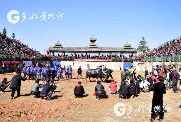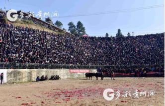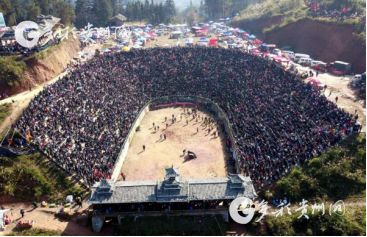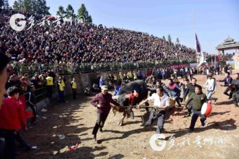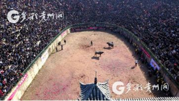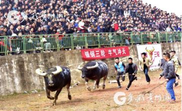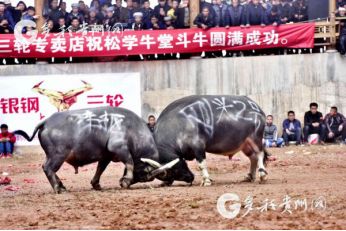 貴州省從江縣第十五屆原生態(tài)侗族大歌節(jié)的前一天,恰逢該縣逢亥斗牛日,丙妹鎮(zhèn)松學(xué)斗牛塘、谷坪鄉(xiāng)四寨河斗牛塘同時(shí)舉辦傳統(tǒng)牛王爭(zhēng)霸賽,喜迎一年一度“侗族大歌節(jié)”的到來(lái),共有來(lái)自周邊村寨的80頭水牯牛參戰(zhàn),斗牛活動(dòng)場(chǎng)上名牛角逐,場(chǎng)面異彩紛呈,吸引數(shù)萬(wàn)名觀眾前來(lái)觀戰(zhàn)。