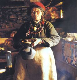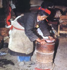 門(mén)巴族婦女在用羊皮囊提煉酥油