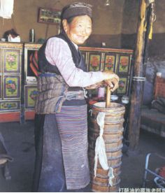 藏族生活在號(hào)稱“地球第三極”的青藏高原上,高寒的高原氣候,嚴(yán)酷的生存環(huán)境,造就了藏民族勇敢剛毅的民族個(gè)性,也形成了藏民族獨(dú)具高原特色的飲食文化,藏鄉(xiāng)的酥油茶便是其中一朵奇葩。酥油茶是藏鄉(xiāng)群眾日常生活所必需的一種飲料,也是藏族人民待客、禮儀、祭祀等活動(dòng)不可或缺的用品,極具民族特色和文化內(nèi)涵。剛進(jìn)藏的漢族干部,要適應(yīng)高原環(huán)境,首先要過(guò)生活關(guān),其中重要的一條就是能不能喝酥油茶。顧名思義,酥油茶由酥油、茶和食鹽三種原料做成。