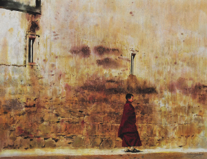 在麗江的束河古鎮(zhèn),他坐在小溪邊,吹著清涼的微風(fēng),聽著對面咖啡屋傳來的低吟慢唱,心情舒暢地畫著自己的畫。很快,一幅《水邊咖啡屋》就在這不經(jīng)意間誕生了。在梅里雪山,早晚都能看到人們所說的日照金山的美景,打開窗戶,暖陽透進(jìn)來照在身上,就這樣畫著藏族人心中的神山,他覺得實(shí)在找不出還有比那一刻更美好的感覺了。