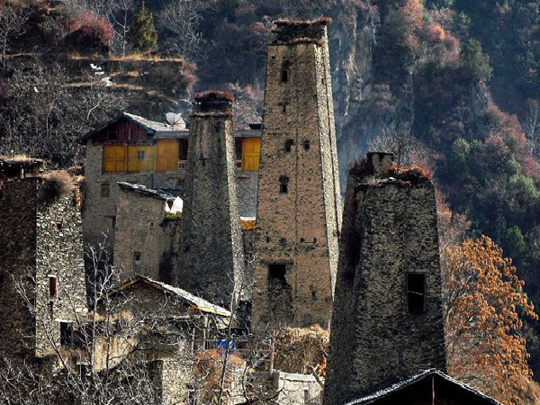在羌語中,碉樓被稱為“邛籠”,意為美麗、高貴的房子,早在2000年前《后漢書·西南夷傳》就有羌族人“依山居止,壘石為屋,高者至十余丈”的記載。碉樓的高度在十米至三十米之間,用于御敵、貯存糧食和柴草。碉樓有四角、六角、八角幾形式,有的高達(dá)十三四層。建筑材料是石片和黃泥土,墻基深1.35米,以石片砌成。石墻內(nèi)側(cè)與地面垂直,外側(cè)由下而上向內(nèi)稍傾斜。修建時不繪圖、吊線、柱架支撐,全憑高超的技藝與經(jīng)驗(yàn)。建筑穩(wěn)固牢靠,經(jīng)久不衰。自唐朝來,羌族人民因各種原因向西北遷移,到了西藏和青海,所以現(xiàn)在,羌族碉樓也往往被稱為藏族碉樓。