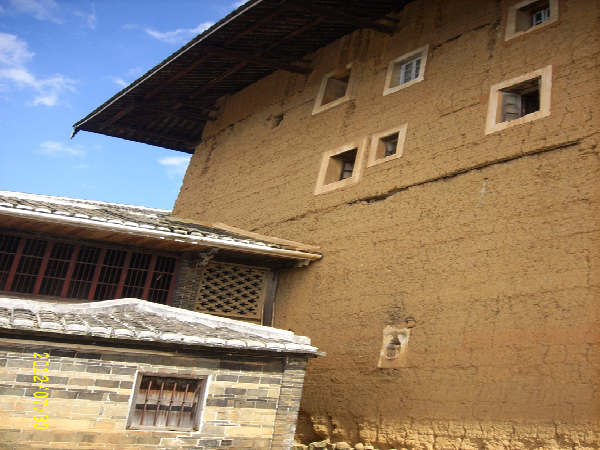 土樓和長城差不多,是用糯米、石灰、蛋清和泥土混合而成的外墻,內部是用黃木和杉木,夏可抵暑氣,冬可抵冽風,還可自動調節(jié)室內的溫度。