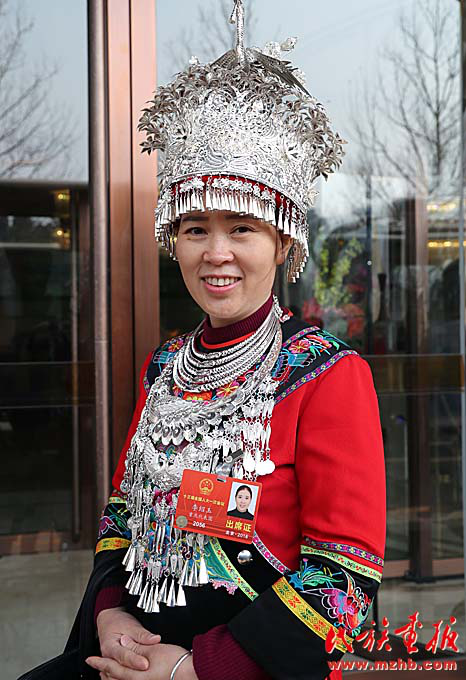 “頭頂高高的銀飾,脖子上一圈圈精美的項圈,走起路來叮當作響,來自重慶市彭水苗族土家族自治縣的全國人大代表李紹玉(苗族)的這一身穿戴,一出現(xiàn)就很抓人眼球。再細看,這一身大紅的苗族傳統(tǒng)衣裝上,胸前、袖口還有繁復精致的刺繡。