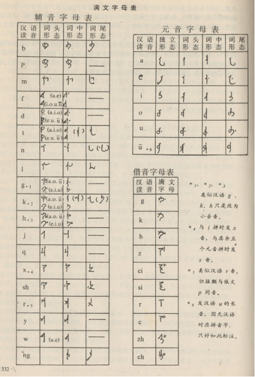 滿文字母有元音6個(gè)、輔音字母19個(gè),借音字母10個(gè)。