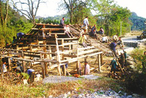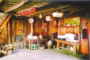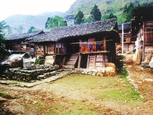 筆者看到的干欄式木樓和吊腳樓在使用的功能上相差無幾,上層住人待客,樓下四壁用木板圍擋,圈養(yǎng)畜禽,存放燒柴、農具和秋收臨時堆放的糧食。豬圈靠里側依柱圍欄,其它空閑的地方打掃得干干凈凈,有的將織布機放在樓下明亮的地方。住房一般5間,兩頭兩間是偏廈,中間3間是寬敞的堂屋,一頭設火塘、土灶,為烤火、煮飯之處;另一頭的中柱供臨時設席敬神之用,也有的在板墻上設佛龕神位,供奉祖先;臥室依房柱用木板靈活隔間。大門有的開在房山墻一側,也有開在中間的,皆登石階、板梯而上。吊腳樓一棟挨著一棟,小巷道曲折狹窄,只容牽牛和順向挑擔通過。