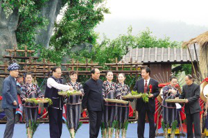 黔西南州領(lǐng)導(dǎo)和望謨縣委書記鄧家富(右三)、縣長黃興文(前排左三)為望謨縣各族人民和各位來賓祈福,播撒幸福種