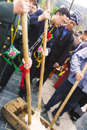 黔西南州委書記陳鳴明(中)與布依族同胞在活動現(xiàn)場打糍粑