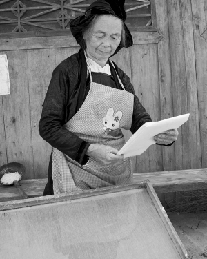 占里村共有182戶827人,這里的侗族古法造紙術(shù)源遠流長,全村從事造紙業(yè)的就有170戶,占總戶數(shù)的93%。這里的造紙業(yè)依然保留著原始的家庭作坊和世代傳承的手工制作方式。這種古法造紙技藝以構(gòu)樹皮為原材料,添加獼猴桃藤、野棉花根,經(jīng)過水浸泡、石灰腌制、蒸煮、碓爛、攤曬、燒堿漂白、打漿、瀝水、抄紙、烤干等72道工序,最終制成白皮紙。