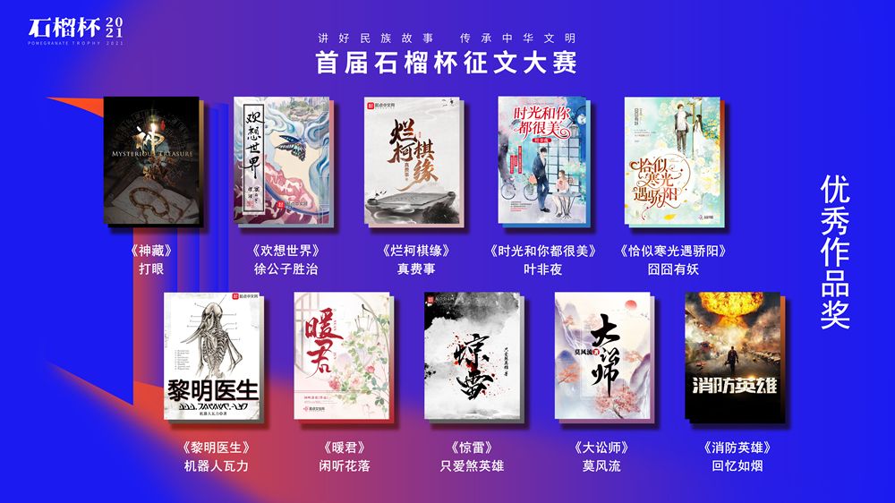 6月19日,民族題材網(wǎng)絡(luò)文學(xué)創(chuàng)作論壇暨首屆石榴杯征文大賽頒獎(jiǎng)典禮在京舉行。作為國(guó)家民委主辦的“中華民族全家?!毕盗谢顒?dòng)之一,首屆石榴杯征文大賽得到了國(guó)家民委文化宣傳司和中國(guó)少數(shù)民族文化藝術(shù)促進(jìn)會(huì)的指導(dǎo)與支持,由閱文集團(tuán)聯(lián)合天成嘉華文化傳媒、中國(guó)民族文化資源庫(kù)、中國(guó)民族文化資源網(wǎng)共同舉辦。本屆大賽以“講好民族故事 ,傳承中華文明”為主題,涌現(xiàn)出眾多弘揚(yáng)民族精神、表達(dá)文化自信、傳播正能量的作品。經(jīng)過(guò)專家推薦及嚴(yán)格評(píng)審,《草原有座蒙古包》、《走西口之天山行》、《彩云微光》等三部作品獲“最具民族風(fēng)采獎(jiǎng)”,《神藏》、《歡想世界》、《爛柯棋緣》、《時(shí)光和你都很美》、《恰似寒光遇驕陽(yáng)》、《黎明醫(yī)生》、《暖君》、《驚雷》、《大訟師》、《消防英雄》等十部作品獲“優(yōu)秀作品獎(jiǎng)”。所有獲獎(jiǎng)作品都將收錄入中國(guó)民族文化資源庫(kù)。中國(guó)作家協(xié)會(huì)副主席、書記處書記吉狄馬加表示,本屆石榴杯大賽是在黨和國(guó)家長(zhǎng)期以來(lái)堅(jiān)持的對(duì)民族文化、少數(shù)民族作家創(chuàng)作和民族題材創(chuàng)作的大力扶持下,依托網(wǎng)絡(luò)文學(xué)平臺(tái),將文學(xué)作品與影視作品改編、游戲、動(dòng)漫產(chǎn)品制作結(jié)合起來(lái),探索的一條發(fā)展民族文化的新路,具有開創(chuàng)意義。