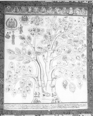藏族“湯卡”的繪制有一個特點,就是不注明繪制日期或繪制人的姓名(除個別的“曼湯”外),但藏族“曼湯”卻另有特點,就是在“曼湯”的最上方留有一定位置來繪制醫(yī)學中的重要人物,特別是古代醫(yī)學家。藏族古代醫(yī)學家往往也是宗教人物。