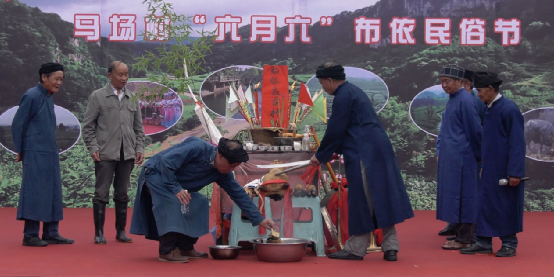 祭祀活動(dòng)由寨老主持。牛頭、活雞等祭品供于案前,寨老穿著布依族的藍(lán)袍,誦頌著古老神秘的經(jīng)文,黝黑的臉上寫(xiě)滿了對(duì)祖先、神靈的虔誠(chéng)。而其他幾位德高望重的寨中老人,這時(shí)便協(xié)力殺了雞,人們用雞血淋紙旗插于火盆中,以火盆代替稻田,意為雄雞吃盡蝗蟲(chóng),糧食豐收,馬馱不盡。