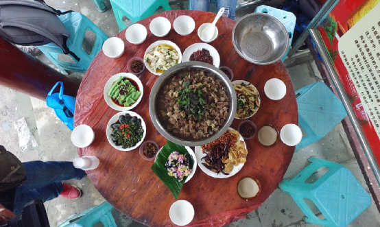 喝罷三碗阿姐手中的米酒,這滿桌的美食就等著動(dòng)箸了。長(zhǎng)桌宴席的主菜,即是為了“六月六”祭祀而宰的牛。那一大盆牛肉堆積如山,面上灑滿薄荷,清香四溢,味美量足,一桌人都吃不完。一方面足見(jiàn)布依人民的豪爽,另一方面也許是為了大家相聚的時(shí)間更多,在餐桌上把酒言歡。