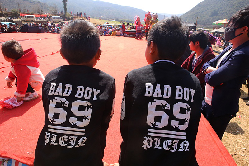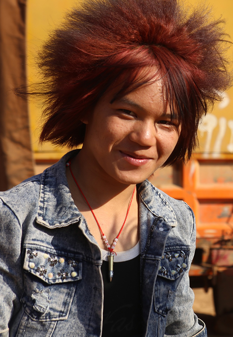 與女性不一樣,這里的男性不講究穿苗服。大多數(shù)苗族年輕男子如今都在城里打工,他們更愿意展現(xiàn)自己個性時髦的一面,印有外文字母的休閑衣服受到格外的歡迎。新潮的西服皮鞋,嬉皮的休閑牛仔,紋身,墨鏡,耳釘,項鏈……我發(fā)現(xiàn)幾乎所有的年輕男子都會在自己的頭發(fā)上做點(diǎn)文章,而今年的潮流似乎偏向夸張的美感。