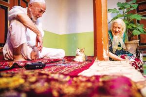 20多年前的喀什古城,老舊巷道縱橫交織,衛(wèi)生狀況較差,一些大膽的老鼠不論白天黑夜在巷道里亂竄,很多人家養(yǎng)貓是為了對付老鼠。如今走在改建后的古城里,所到之處窗明幾凈,而這里的貓從捕鼠者變?yōu)榧彝櫸?。貓已適應角色轉變,愜意地享受著暖暖的羊毛毯。老兩口對寵物貓像對自家的孩子一樣呵護備至。
