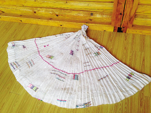摩梭傳統(tǒng)手工百褶裙 阿七獨(dú)支瑪(參展人): 媽媽把許多古老的摩梭圖案編進(jìn)裙布里,并在裙布下方織一條不接頭的紅線,代表生命的輪回,這是摩梭人的一種人生觀。摩梭女性穿的裙子是百褶裙,媽媽編織好圖案及棉布衣后,還要再一個(gè)一個(gè)地縫上褶線,雖然很花工夫,但制作衣服的時(shí)候,是我見(jiàn)過(guò)的媽媽最開(kāi)心的時(shí)候。