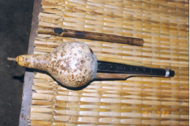 阿昌族的樂器主要有竹琴、洞簫、葫蘆簫(右圖,劉軍攝)、三月簫、銅口弦、三弦、象腳鼓(下圖,蒙哥提供)、铓鑼等。葫蘆簫是用葫蘆連接三根竹管制成的,它有7個(gè)音,音量小,音調(diào)低緩圓潤(rùn),一般晚上用。三月簫用一根竹管制成,也有7個(gè)音,它的音量大,音色細(xì)亮,多在白天使用。葫蘆簫和三月簫不僅是阿昌族人民心愛的傳統(tǒng)樂器,還是男女青年傳情示愛的媒介。