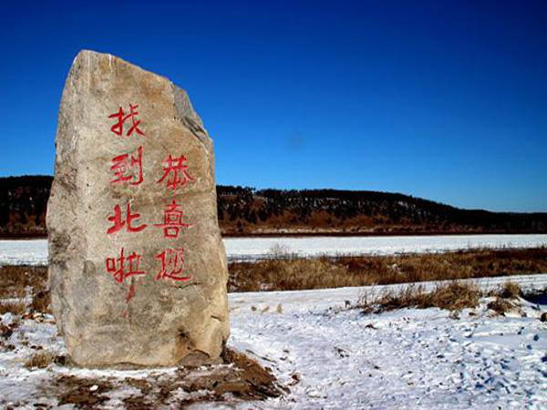 沿著形態(tài)各異的“北”字,可以走到中國最北端的廣場(chǎng)——北望埡口?!皷|經(jīng)122°20'43。48〃E北緯53°29'52。28〃N”的標(biāo)志就立在這里,旁邊一塊巨石上刻著“中國北極點(diǎn)”。