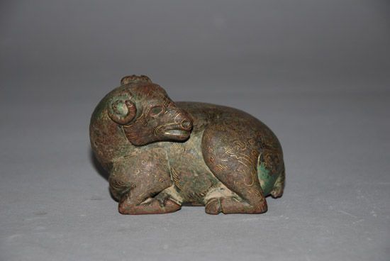 銅羊做蹲臥式,盤(pán)角,回首,兩眼凝視,似乎聞聲將起,體型肥碩,神態(tài)溫馴、生動(dòng)活潑,栩栩如生。在鑄造上工匠利用傳統(tǒng)的錯(cuò)金銀工藝,用金絲銀線鑲嵌全身,凸顯出羊首輪廓和纖細(xì)卷曲的絨毛,金光銀彩交相輝映,更顯得生氣盎然。兩漢時(shí)期不但繼承了先秦時(shí)代已有的錯(cuò)金銀技術(shù),而且還有一定的創(chuàng)新,工藝更為精湛。