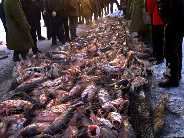 隨著“魚把頭”高亢的號子,馬拉人拽,一張幾千米長的大網(wǎng),被緩緩地拉出冰面。鯉魚、鯽魚、鰱魚、鯰魚等各種魚類一群一群翻上了冰眼。轉(zhuǎn)眼之間,冰面上堆起了一個(gè)個(gè)魚垛。