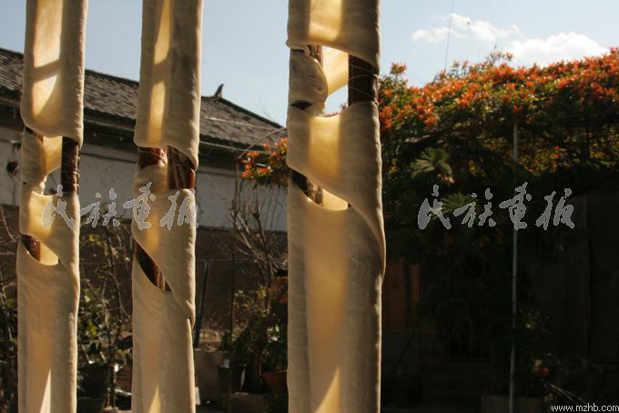 冬日里的一個(gè)午后,我來(lái)到蝴蝶泉邊的周城村,在一戶白族人家里探訪了乳扇的制作過(guò)程。剛到大門口,就聞到一股淡 淡的乳香。走進(jìn)院子,只見(jiàn)一位白族婦女正舉著一根長(zhǎng)長(zhǎng)的桿子往老高老高的鐵絲上掛,院子里掛滿了一排排白花花的像是裹著白布的竹桿。走近一看,桿子上白白的東西并不是白布,向?qū)Ц嬖V我,這就是乳扇。