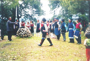 頌藥仙活動(dòng)各村為陣,是一項(xiàng)以傳授藥物知識(shí)和防病方法為主題的歌舞活動(dòng)。早早吃過晚飯后,人們集中到白天洗揀藥物的水邊,用青松和花草編扎的轎子抬上藥仙的肖像,敲鑼打鼓、載歌載舞,把藥仙抬到她的化身“定居”的山林中,舉行頌贊藥仙功績(jī)的儀式。活動(dòng)場(chǎng)地四周,插遍各種花枝,花枝上掛滿姑娘們精繡的荷包,荷包中裝的是各種治病的藥粉。場(chǎng)中央燃燒著熊熊篝火,火邊供著藥仙的肖像。參加活動(dòng)的人,各持兩束用藥用植物編成的“花束”,在歌頭的帶領(lǐng)下,眾人手舞“花束”,環(huán)篝火踏歌而舞。用動(dòng)聽的歌聲,歌唱藥仙嘗百草、治疾病的故事;介紹用中草藥防病、治病的知識(shí)……踏歌接近尾聲時(shí),人們便把手中舞耍的“花束”丟進(jìn)篝火中焚燒,象征把各自身上的病疾丟盡,實(shí)際上是借焚藥草來(lái)達(dá)到消毒防病的目的。