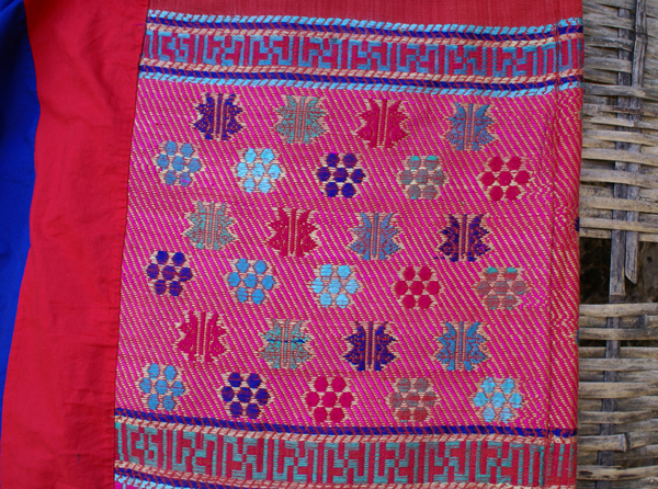 三角鉤鋤是毛南族特有的生產(chǎn)工具,毛南語叫“拱”。它小巧輕便,適合在雞窩地里中耕鋤草,又用于點(diǎn)種黃豆。種黃豆還有一種木制的“點(diǎn)穴錘”,用8寸到1尺長(zhǎng)的金剛木削成圓桿,形如搟面杖,中間插一木柄,手握木柄在泥土里一錘,就成一個(gè)如雞蛋形的坑,即可放入黃豆,蓋上草木灰。這種“點(diǎn)穴錘”一錘一穴,工效很高,是種黃豆的最佳農(nóng)具。此外還有禾剪、割煙刀等(圖為毛南族織錦)。