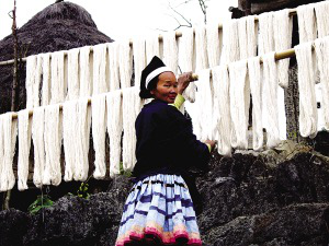 白褲瑤服飾的面料都是老阿婆手搖紡車,把一捆捆棉麻用勤勞智慧的巧手紡織成細紗,合著穗捻成勻稱的線。阿妹們再將線繞到線筒上,然后輕涮漂洗,繞到高腳糧倉下。線晾干后進行紡織,一塊塊自紡的棉紗土布就形成了,之后就可以在這塊布上盡情“作畫”了。