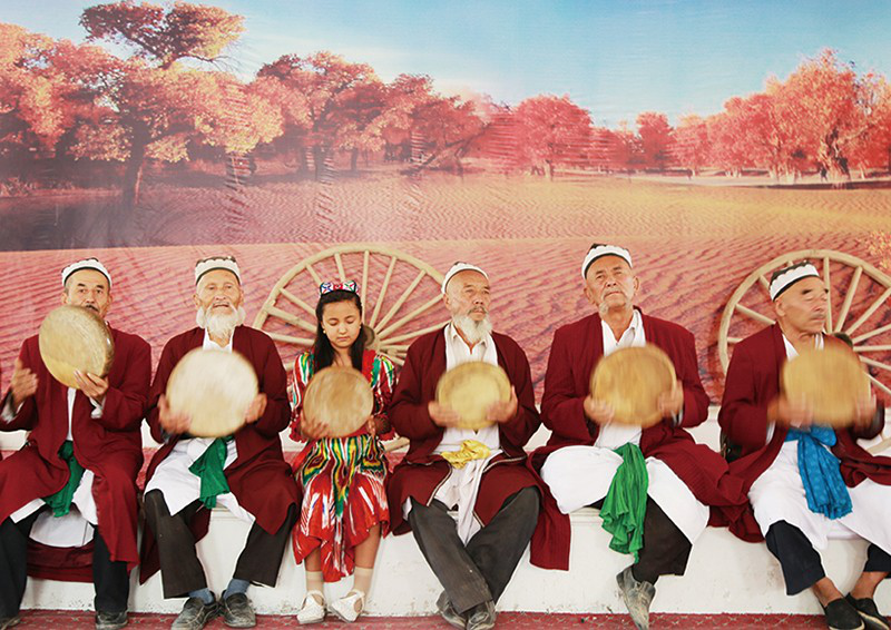 從麥迪娜9歲起教她達(dá)甫手鼓的是母親,把她打扮得漂漂亮亮的、去趕一場(chǎng)又一場(chǎng)麥西來(lái)甫的也是母親。作為央塔克鄉(xiāng)文化站站長(zhǎng),麥迪娜的母親整年都忙碌得要死。麥蓋提縣央塔克鄉(xiāng)以刀郎舞、農(nóng)民畫立鄉(xiāng),觀光者多,活動(dòng)多,任務(wù)多,接待多。它不僅是旅游之地,也是生活之地。麥迪娜的母親是位典型的維吾爾族女性,眉眼如刻,目光流轉(zhuǎn),婚后迅速發(fā)胖。在一大群女人當(dāng)中,她一定是最搶眼、最熱烈、最能干的那個(gè)。無(wú)論哪家舉行麥西來(lái)甫,都會(huì)邀請(qǐng)她。她總是提前到來(lái),手腳麻利地幫忙,氣度昂揚(yáng)地端桌布菜,熱情洋溢地放歌起舞。有時(shí),母親也會(huì)提前帶麥迪娜到舉辦麥西來(lái)甫的家庭中,麥迪娜就會(huì)學(xué)母親的樣子,進(jìn)廚房幫忙干活,直到麥西來(lái)甫開始,才換上衣裙,擠身樂(lè)師中間。麥迪娜沒有時(shí)間像其他孩子那樣,在鄉(xiāng)野、麥西來(lái)甫上盡情嬉戲,正如她的母親,只能將女兒的日常生活托付給奶奶照顧。
