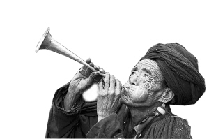 在隆重悲痛的喪禮中,所吹的是拴有白布的大號嗩吶。調子低沉哀怨,像是一曲“喊魂曲”,應和著親人的悲鳴與哭泣,呼喊著逝去的親人回來。待到黑色的棺木被八個人抬往墓地時,大號嗩吶一路在前帶隊,遇水逢橋必吹,像是在開路,又像在引導亡魂歸來。下葬時,大號嗩吶聲一直不間斷地吹響,直到一座新墳立起,才算是完成告別儀式。大號嗩吶聲的停歇,從某種程度上代表著家人已經(jīng)盡孝了。
