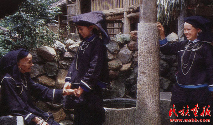 婦女的服飾更具特點(diǎn),無論老少,都喜歡穿右蓋大襟和葫蘆狀矮腳圓領(lǐng)的緊身短式上衣,下身以寬褲腳、大褲頭的褲子相搭配,腰系黑布做成的大圍裙,頭帶黑布大頭巾。其圍裙既寬且長,戴時(shí)能系周身有余,裙底垂掛到小腿下部,圍裙不僅作為裝飾,而且可以作為勞動工具,遇趕圩或走親訪友和勞動時(shí),可將圍裙底翻卷上來作成小包袱,用以包裝和盛裝物品。婦女頭巾都是一塊自己紡織染成的長條黑布,戴時(shí)先圍繞在頭上,然后翻折擺布成火棱形的圖樣,罩在整個頭上,再把頭巾的兩端分別垂掛到雙肩上,看上去樸素美觀。同時(shí)還可以當(dāng)做帽子遮蔭用。她們的衣邊、衣角、袖口、裙邊和頭巾的四邊都用紅布或黃布剪成小條以后鑲捆上去,有的則用紅、黃、藍(lán)色絲線繡成波浪形的線條,使黑中襯出紅、黃、藍(lán)色的線條來,清雅明亮,色彩協(xié)調(diào)。再加上頭發(fā)插著龍頭形的銀簪,頸項(xiàng)上帶有銀鏈或項(xiàng)圈,手帶銀圈、玉鐲,耳掛珍珠耳環(huán)等,使人一看,黑中閃艷,樸素之中亦有玲瓏之美,表現(xiàn)了她們獨(dú)特的審美觀。