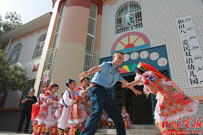 民族團結是國家統(tǒng)一、繁榮昌盛的前提和保證,各民族“共同團結奮斗,共同繁榮發(fā)展”是我國民族工作的主題。全國各地扎實開展民族團結進步創(chuàng)建工作,平等團結互助和諧的社會主義民族關系進一步鞏固和發(fā)展。2011年,空軍駐新疆和田某指揮所首次投資80萬元,開辦了和田八一愛民雙語幼兒園,讓30個家庭的孩子進入雙語班成為首批“藍天春蕾兒童”。圖為維吾爾族戰(zhàn)士艾力夏提和該園兒童一起玩老鷹捉小雞游戲?!睹褡瀹媹蟆?011年第11期