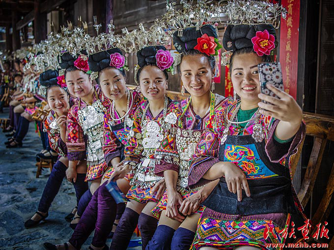 經(jīng)歷改革開放40年的發(fā)展,我國社會生產力、綜合國力、人民生活水平實現(xiàn)了歷史性跨越,全黨全國各族人民要更加緊密地團結在以習近平同志為核心的黨中央周圍,高舉中國特色社會主義偉大旗幟,不忘初心,牢記使命,將改革開放進行到底,不斷實現(xiàn)人民對美好生活的向往,在新時代創(chuàng)造中華民族新的更大奇跡。圖為貴州民眾盛裝自拍。《民族畫報》2018年第3期