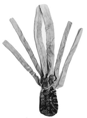 “五星出東方利中國(guó)”錦護(hù)臂,東漢時(shí)期,民豐縣尼雅墓地出土。