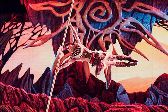 雜技藝術在劇場空間維度的呈現(xiàn),一是把身體作為一種最為本質的符號材料進行直接表現(xiàn);二是通過與物體、音樂、舞蹈、燈光、唱詩等的排列組合,展示技藝的身體與物體、空間的關系,達到彰顯其生命意蘊與美學品質的目的。劇中網(wǎng)吊、綢吊、轉動桿上技巧等項目非常炫技,展現(xiàn)了現(xiàn)代雜技的審美意境,詩與思在舞臺上相得益彰。綢吊極具浪漫色彩,承載著輪回與終極的生命哲理;智者的“唱詩”,凸顯了該劇的史詩特征,增加地域文化和遠古歷史的厚重感。