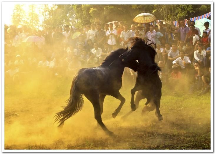 斗馬時,先牽出一匹年輕母馬到場作媒介挑逗公馬,出場的兩匹公馬都想親近母馬,由此引發(fā)一場決斗。誰都想打敗對方而占有母馬,都使出渾身解數(shù),酣戰(zhàn)不止,直至決出勝負(fù)。
