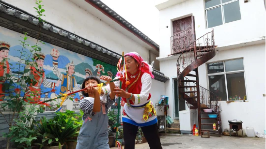整個(gè)慶洞村世世代代都有打霸王鞭的習(xí)慣,何松康老師向我們介紹:“霸王鞭是古時(shí)白族人民在田間勞作過(guò)程中演變而成的舞蹈,舞蹈的手帕好比勞作時(shí)擦汗的手巾,霸王鞭好比勞作時(shí)手中的鋤頭,這舞蹈來(lái)源于天地間,是勞動(dòng)人民的智慧結(jié)晶”。而何松康所舞的霸王鞭是最傳統(tǒng)的樣式,是由爺爺傳承給媽媽,再由媽媽傳承給自己的。如今,她又將其完完整整傳給了自己的兒媳婦及小孫女?!拔易约合矚g打,家里的人也喜歡,幾代人都打霸王鞭,我勵(lì)志要好好地傳下去”,何松康說(shuō)。