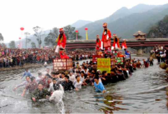 第二次是農(nóng)歷正月十五日上午,分上、下半闕。上半闕仍依十四日走法,至過午一時許,古事列隊從“方龍橋”下河床。鼓樂隊先互相潑水透濕,然后三響神銃,古事棚蜂擁下水,逆水而走。除天宮一棚不能超越外,后棚超前棚,則視為吉利。于是抬夫拼力而為,爭先恐后,不顧天寒水深、河石苔滑,跌倒了再爬起,情緒異常高昂,至下午三時許,一年一度的走古事才在高潮中落下帷幕。